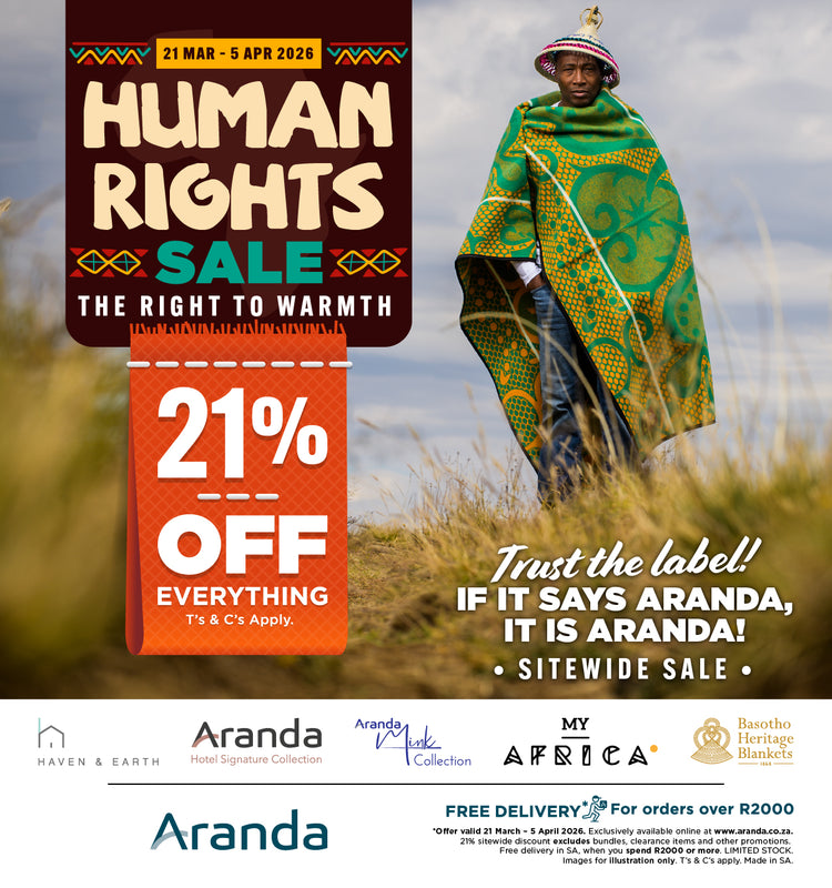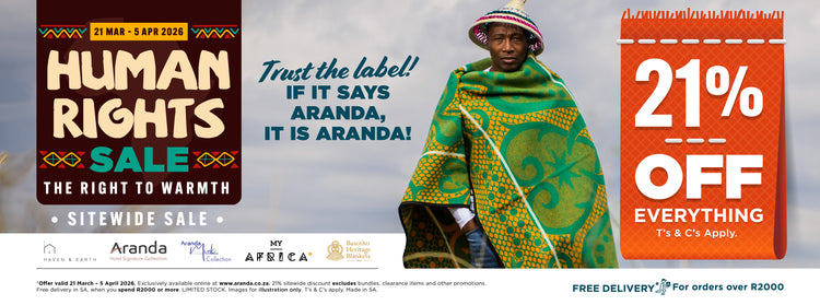 What makes the Basotho blankets unique is the layout of the design, the various symbols used, the bold colour combinations and the characteristic pin-stripe. This stripe was originally a weaving fault which has become a unique part of the design and dictates how the blanket is worn. When worn in the traditional manner, the pin-stripe runs vertically symbolising growth. Traditionally Basotho blankets are manufactured from wool which offers protection from the wind and rain and provides warmth in the high altitude of The Mountain Kingdom.