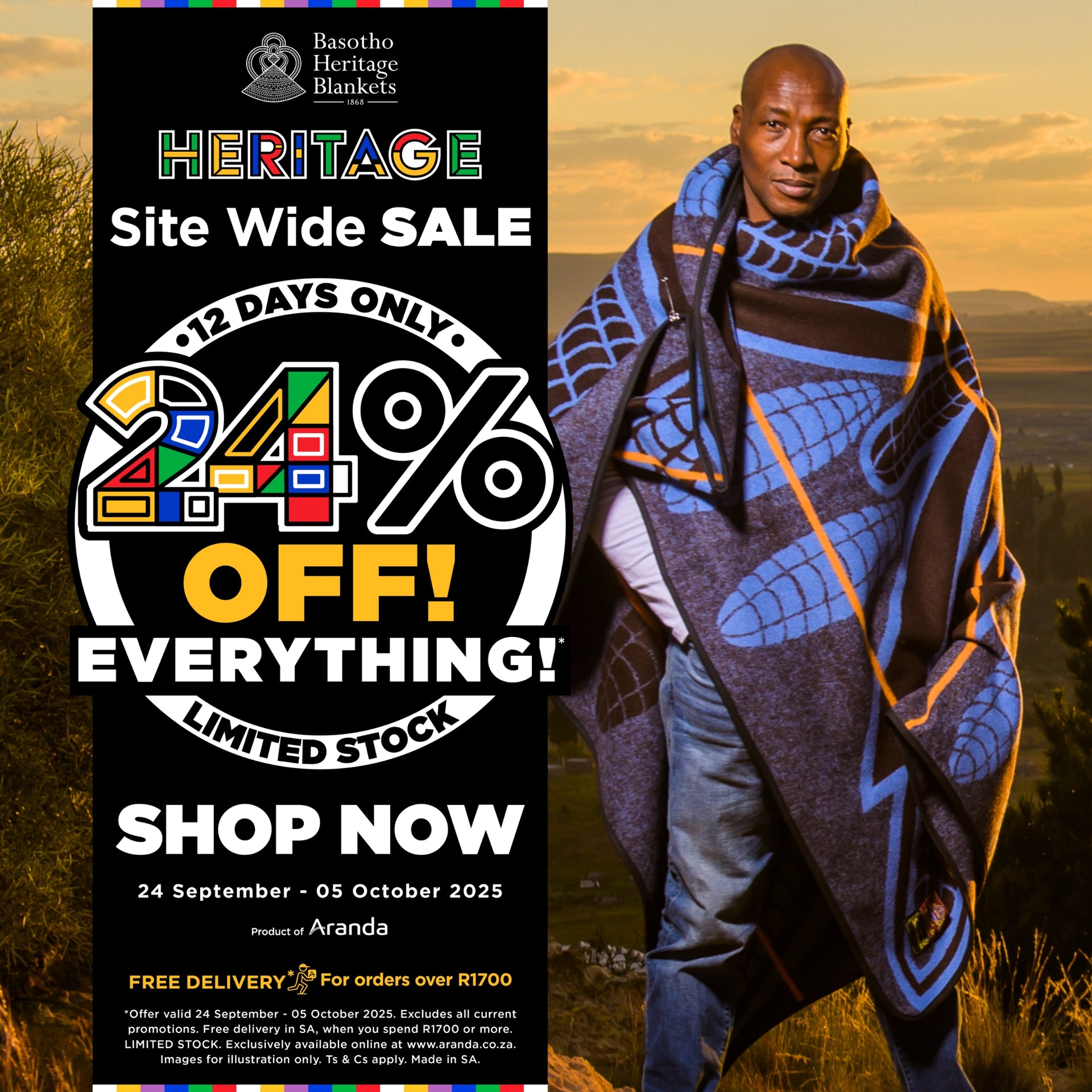 What makes the Basotho blankets unique is the layout of the design, the various symbols used, the bold colour combinations and the characteristic pin-stripe. This stripe was originally a weaving fault which has become a unique part of the design and dictates how the blanket is worn. When worn in the traditional manner, the pin-stripe runs vertically symbolising growth. Traditionally Basotho blankets are manufactured from wool which offers protection from the wind and rain and provides warmth in the high altitude of The Mountain Kingdom.