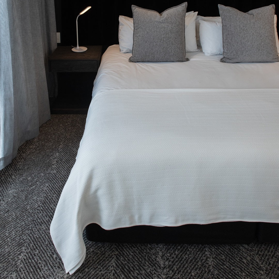 The Aranda Cotton blankets are woven from cotton grown and spun in South Africa. Cotton is a natural fibre that is known for its breathability and excellent wicking properties. This makes these 100% cotton blankets comfortable, durable, warm in winter and cool in summer. The timeless herringbone weave of the Chevron design creates a beautiful surface texture.