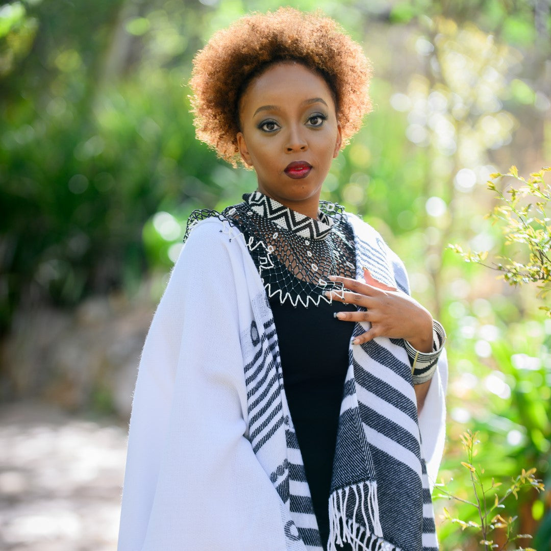 This striking wrap is inspired by Xhosa traditional clothing which features iconic black and white striped designs and geometric patterns.