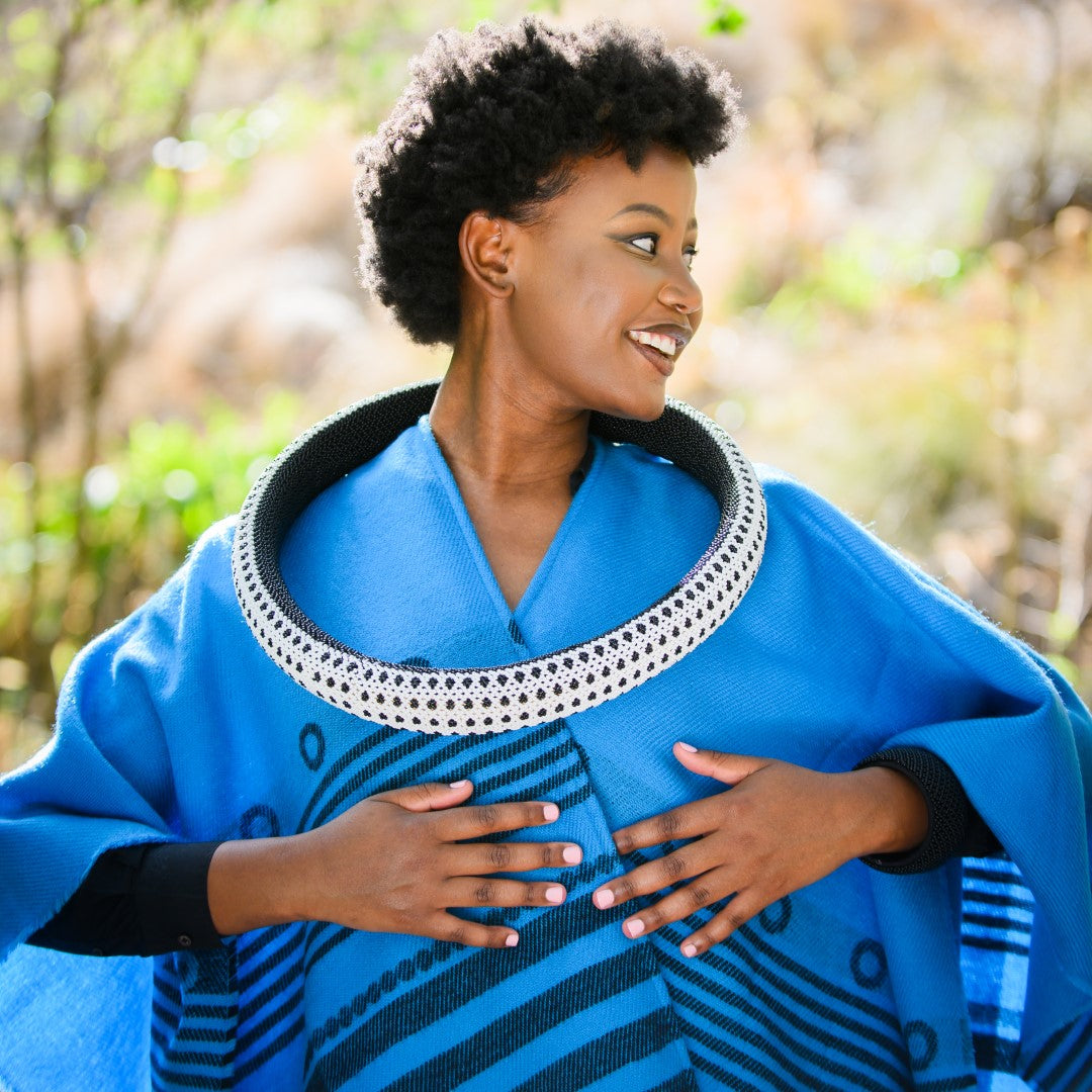 This striking wrap is inspired by Xhosa traditional clothing which features iconic black and white striped designs and geometric patterns.