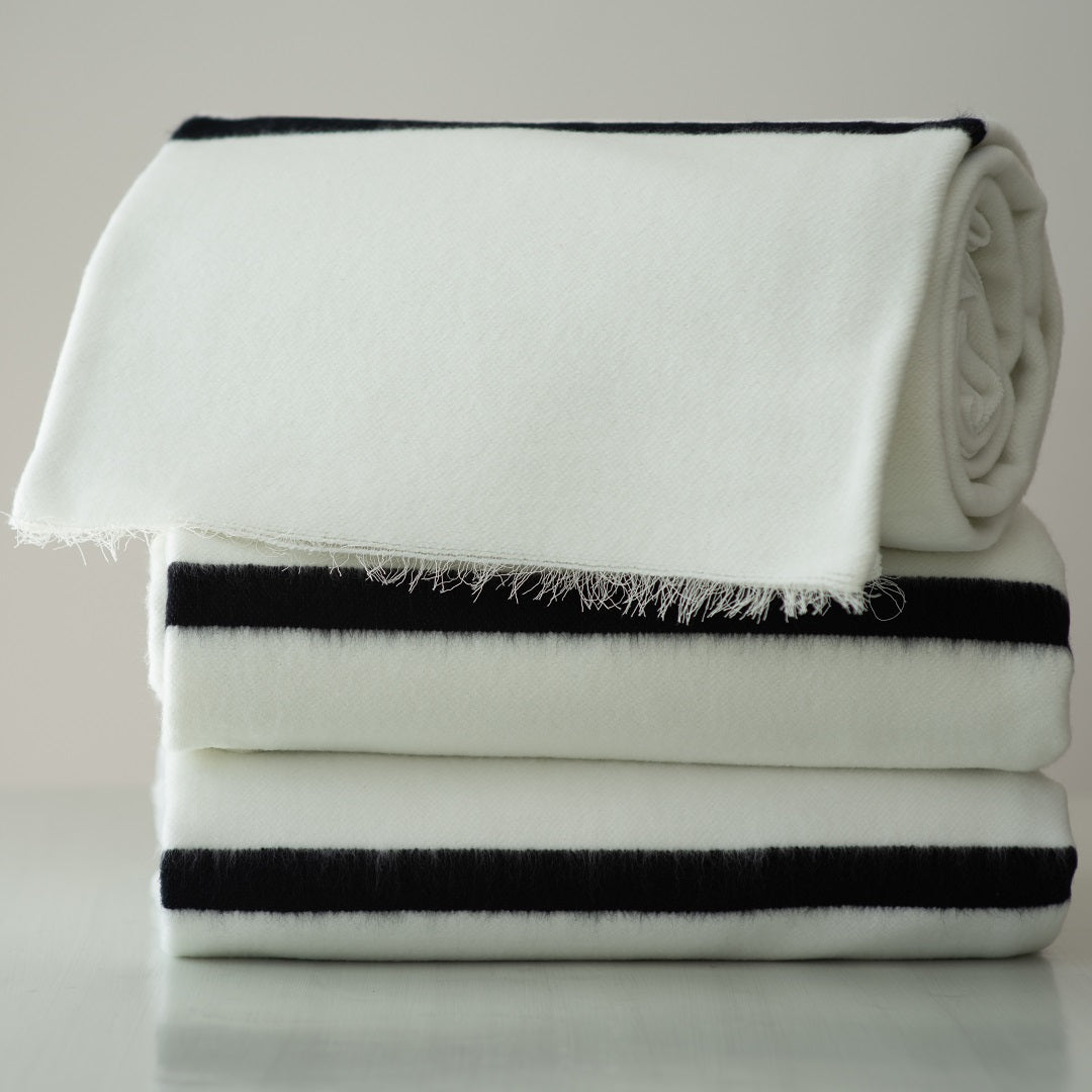 The Ingcawe has a whipped edge whereas the Tribal Black Stipe has an open selvedge to which the family of the deceased will attach a binding and add embroidery depicting the personโs life story.
