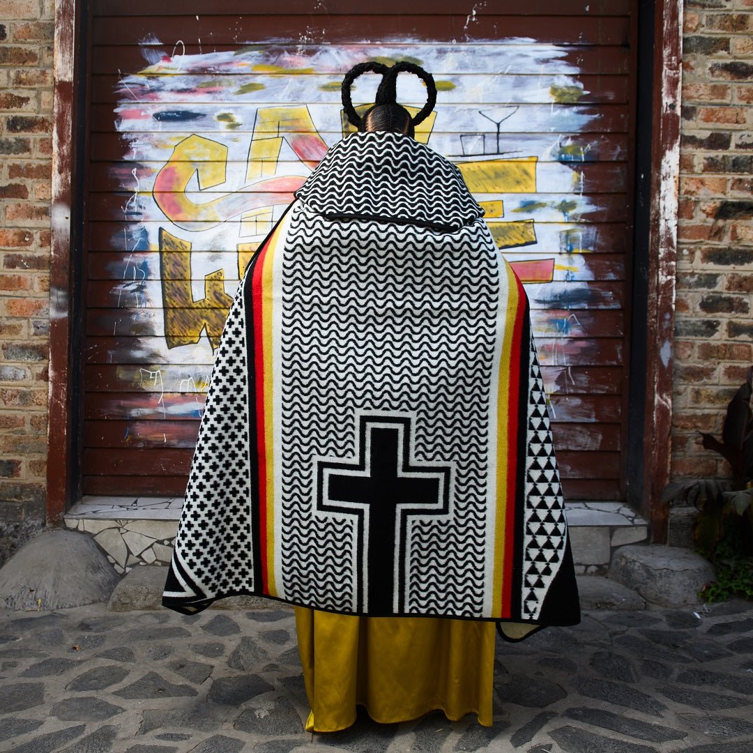 This blanket was inspired by Maleh’s late grandmother, Matlelima Anna Hlalele. Above all of her achievements in life, it is her role as a spiritual leader and nurturer that remains the most important, which she played as the matriarch of her family. Kobo ea Poloko is inspired by one of her grandmother’s favourite verses, Isaiah 61v3 which speaks of being ‘Clothed with the garments of Salvation". This blanket seeks to inspire a nation that continuously strives in faith, as can be heard in the words of the Lesotho National Anthem "Molimo a ko boloke Lesotho". Even in the wake of the independence of African countries in the 1960's, Lesotho is one of the many countries that continued to be faithful to the Christian teachings of the early missionaries. The design features a combination of iconic Basotho and Christian symbols.