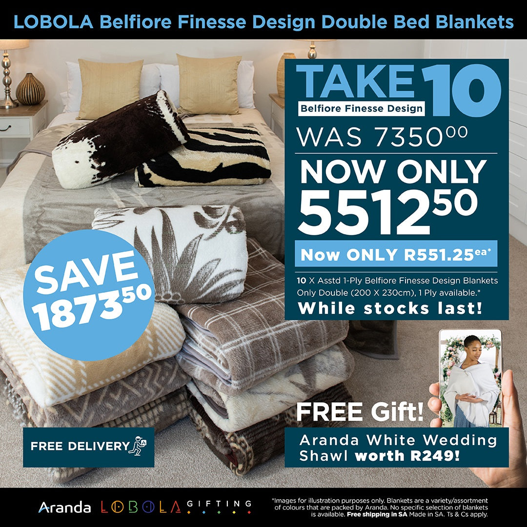 The Belfiore Finesse Designs Lobola Bundle of 10 blankets consists of AssortedΒ designs and colours - Double bed size 200 x 230cm.