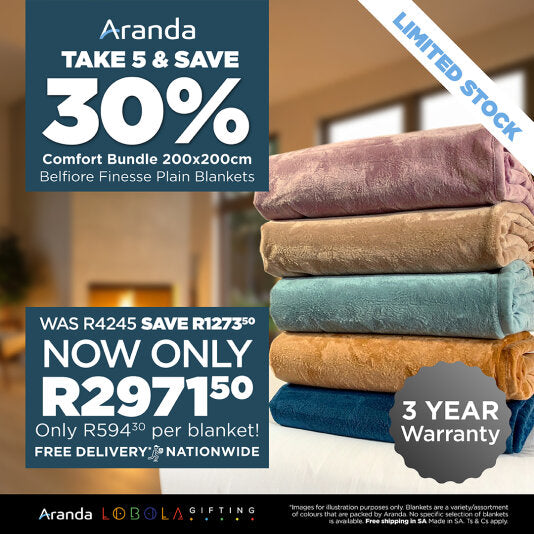 The NEW Belfiore Finesse Comfort Lobola Bundle of 5 blankets in assorted colours is available in 200 x 200cm size.