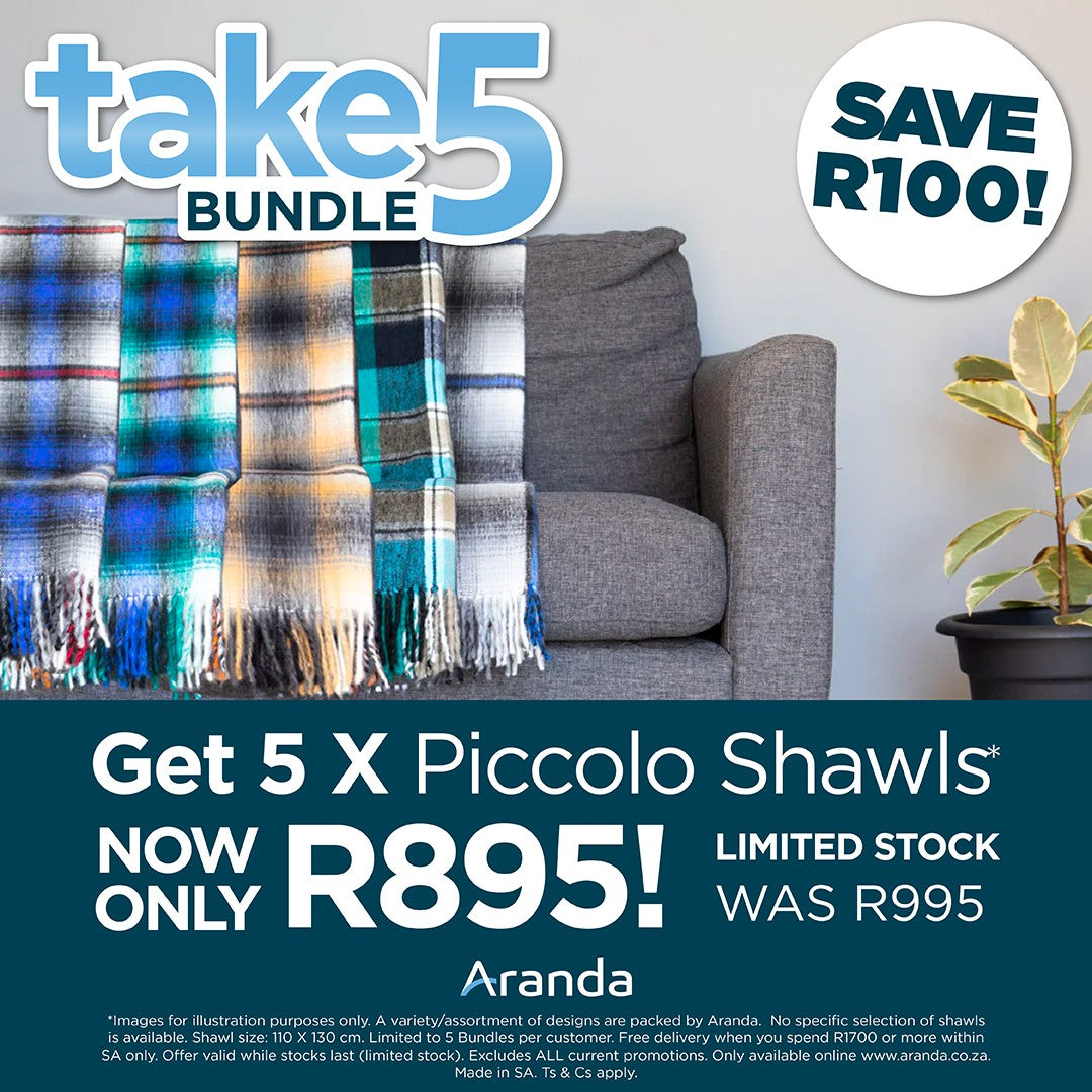 The Piccolo Shawls bundle consists of 5 shawls in an assortment of colours. The Piccolo shawl is traditionally worn around the waist.Β Can be used as a shawl or blanket.