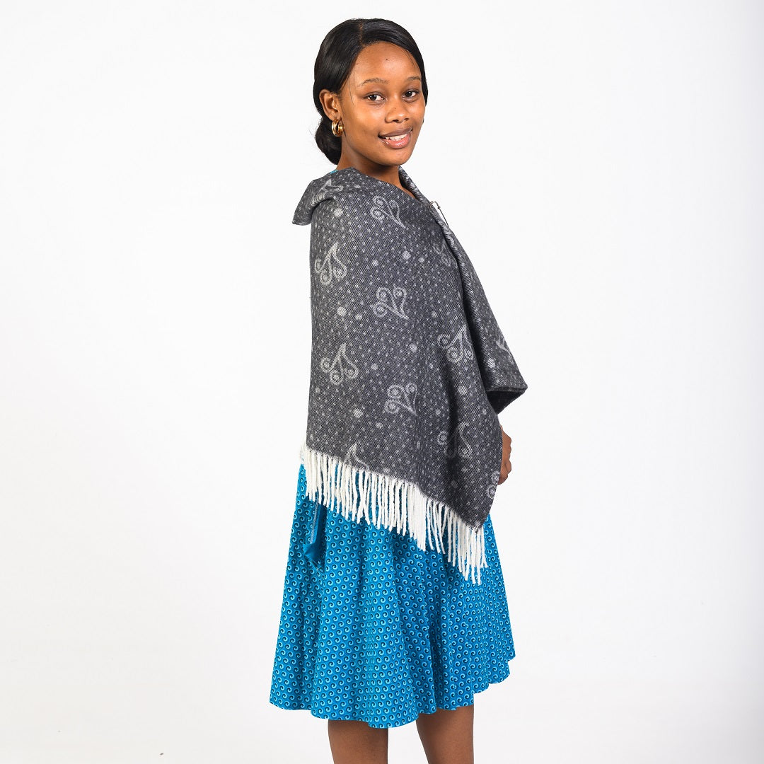 The shweshwe fabric features different geometric symbols and it comes in different traditional and new age colours. This shawl is versatile as it can also be used as a throw in your home.Â