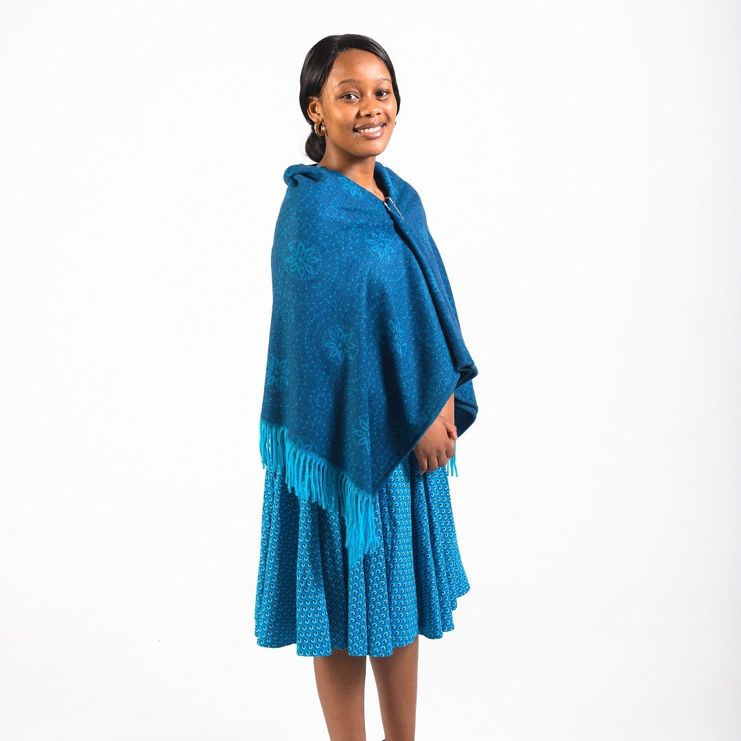 The shweshwe fabric features different geometric symbols and it comes in different traditional and new age colours. This shawl is versatile as it can also be used as a throw in your home.Â