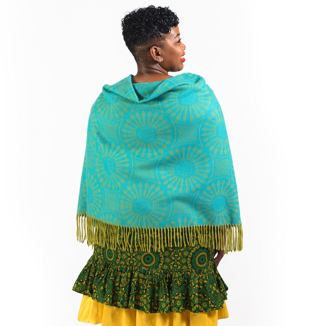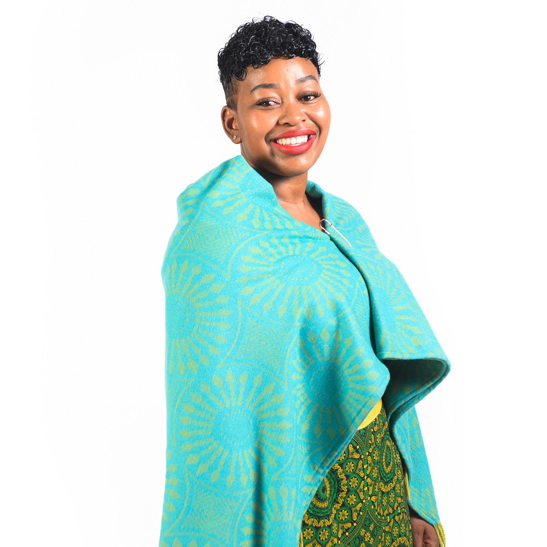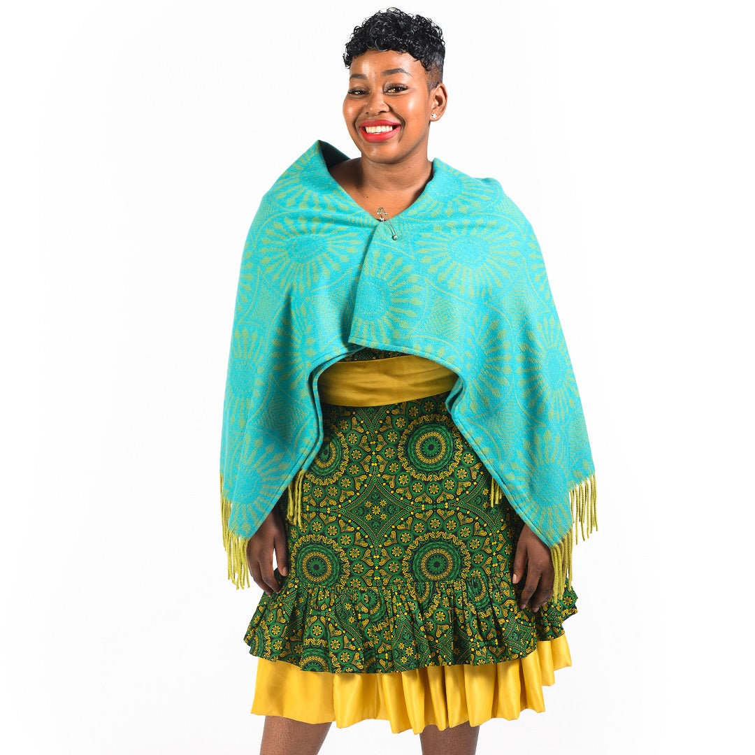 The shweshwe fabric features different geometric symbols and it comes in different traditional and new age colours. This shawl is versatile as it can also be used as a throw in your home.Â