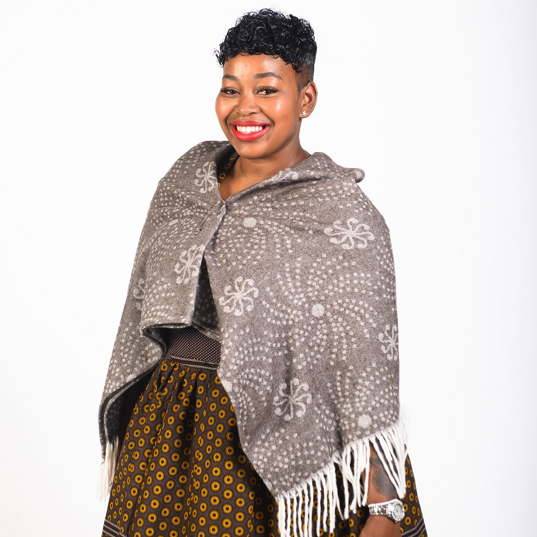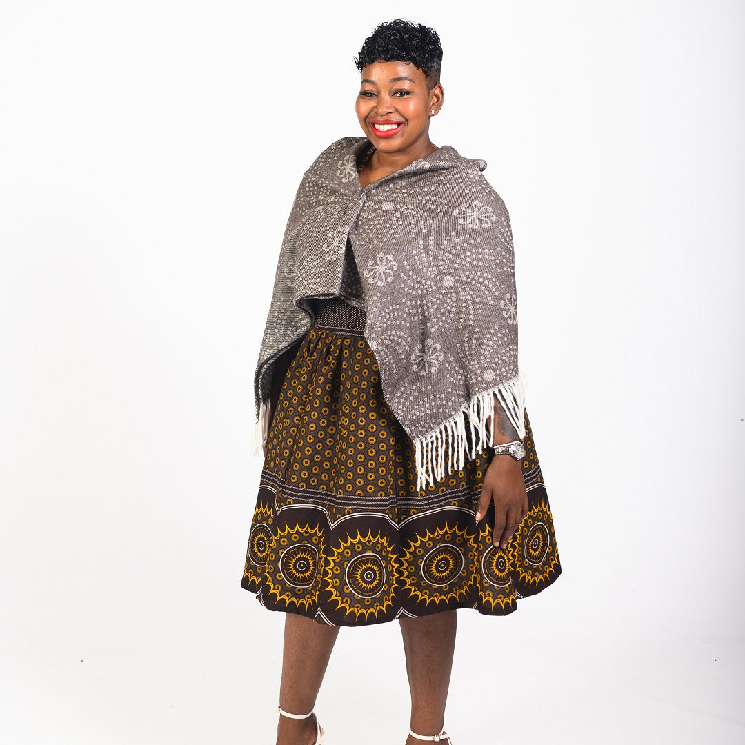 The shweshwe fabric features different geometric symbols and it comes in different traditional and new age colours. This shawl is versatile as it can also be used as a throw in your home.Â