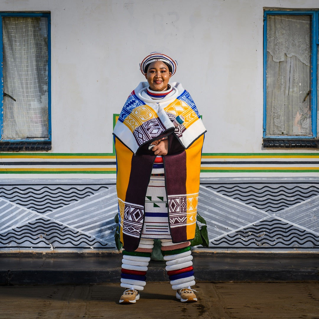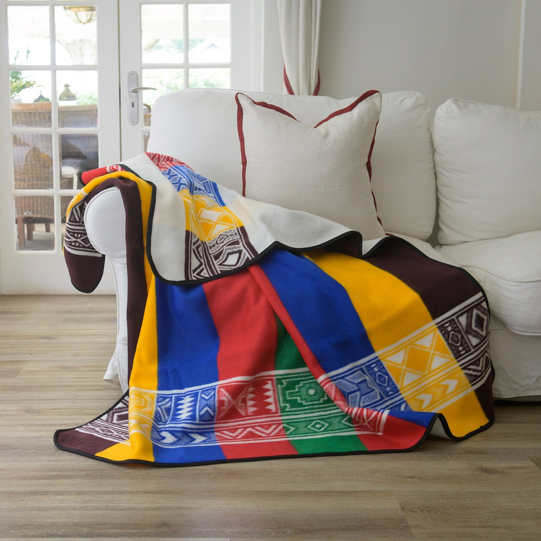 The Ndebele-Thweleni blanket is based on the Umbhalo design with a classic Ndebele designed border on the top and bottom.