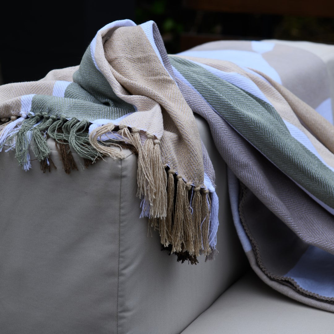 These unbrushed cotton rich throws are suitable for both indoor and outdoor use. With hand-knotted fringes and a contemporary striped design, the Protea Pinstripe is the ideal versatile throw.