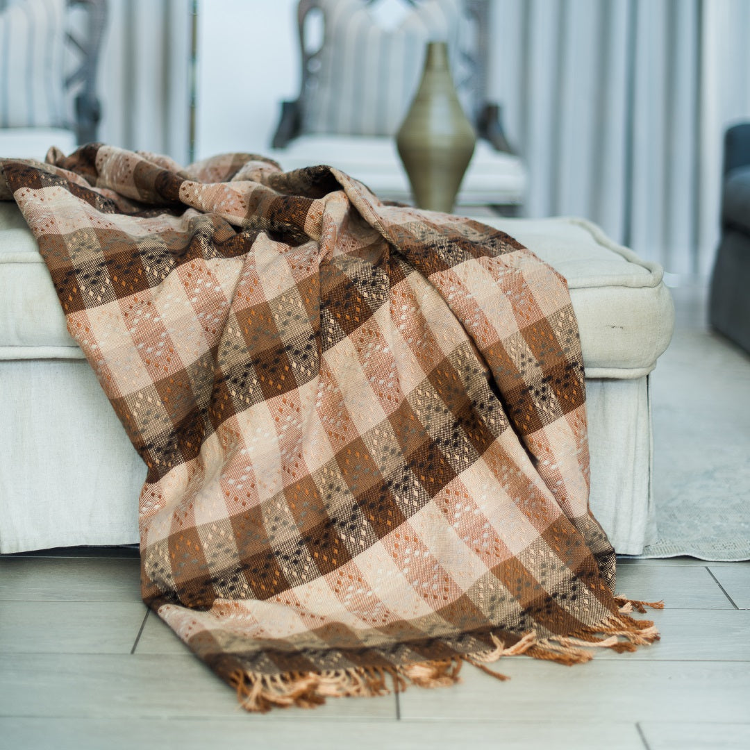 This intricate throw has been inspired by the traditional craft of Zulu basket weaving. The art of Zulu basket weaving has been handed down from generation to generation. Woven from the dyed leaves of the ilala palm, the decorative woven baskets are made for special occasions, such as weddings, the birth of a child, or a good harvest. Each basket is woven by hand and it can take up to one month to produce a medium size basket.Â