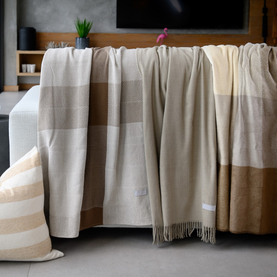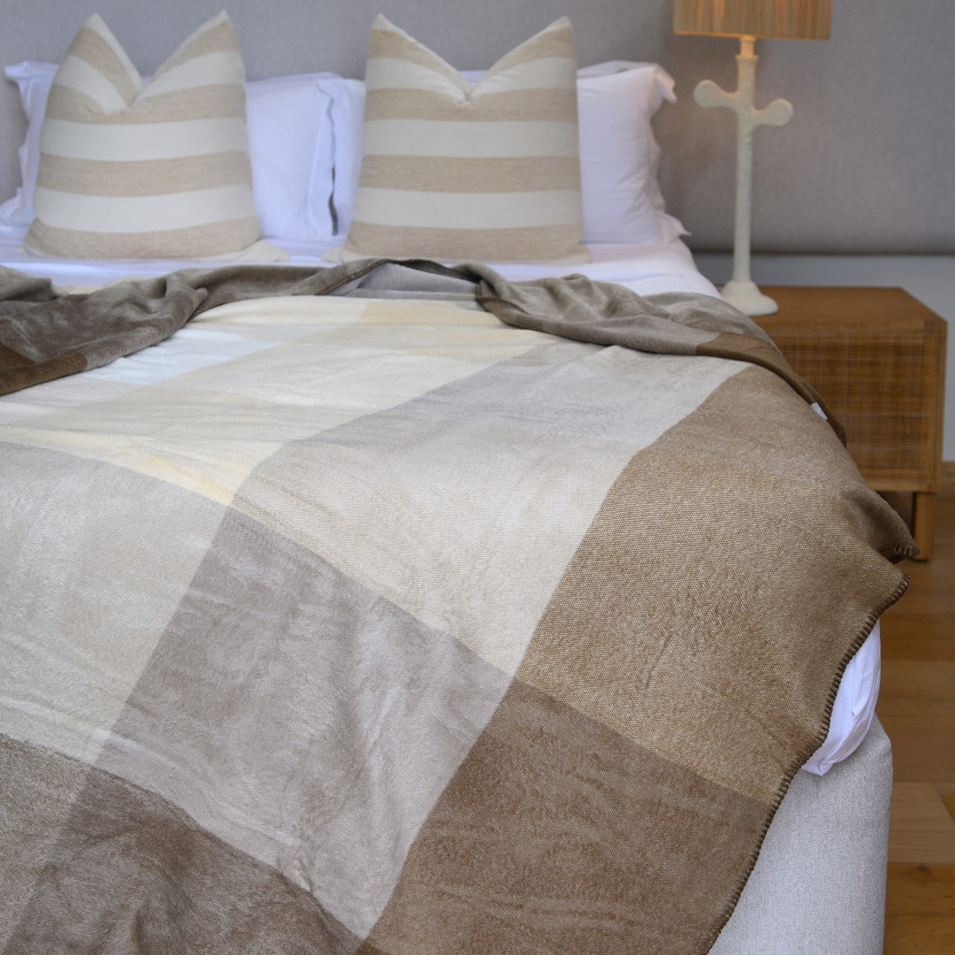 With a suede-like finish, these soft and generously sized throws are available in a modern over-sized checked design. Edged with blanket-stitching, they are the ultimate in quiet luxury.